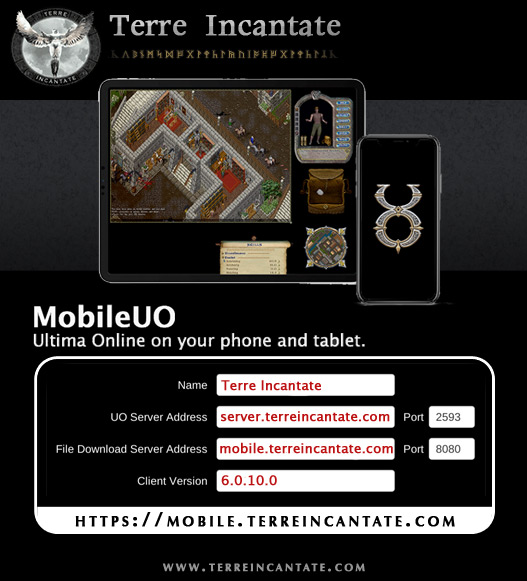 Attraverso il client MobileUO, puoi connetterti ovunque tu sia: scaricalo gratuitamente da Google Play Store o Apple App Store, installa l’applicazione e attendi il download automatico dei file necessari. In pochi istanti sarai pronto a immergerti nel mondo di Terre Incantate, direttamente dal palmo della tua mano.